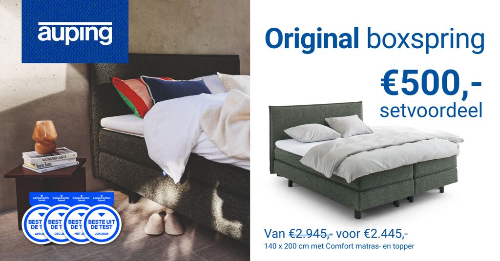 Op onze beddenafdeling voeren wij het merk Auping. Dit gerenommeerde Nederlandse merk, afkomstig uit Deventer, is gespecialiseerd in de productie van boxsprings, matrassen, bodems en ombouwen. De volledige collectie is bij ons verkrijgbaar en onder het genot van een kop koffie zullen wij u voorzien van een passend advies.